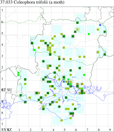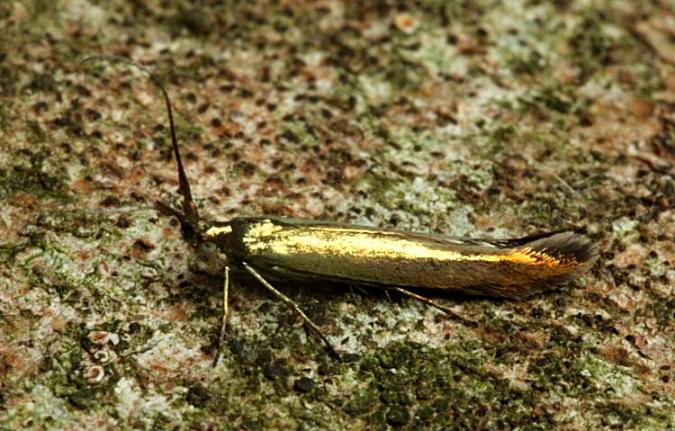 Local on rough grassland, waste ground and roadside verges throughout much of the British Isles, less numerous in Scotland, more numerous in the south. In Hampshire widely but thinly distributed, records increasing in recent years; on the Island still rarely reported. Wingspan 15-20 mm. The comparatively large size, metallic green forewings with copper apex and white tip to antennae, make this species one of the few which can be identified without recourse to dissection of the genitalia, although the differences in size between this and other related species may only be obvious in series of mounted, set specimens. Larva feeds within seedpods of Ribbed Melilot and Tall Melilot, living within a movable case.