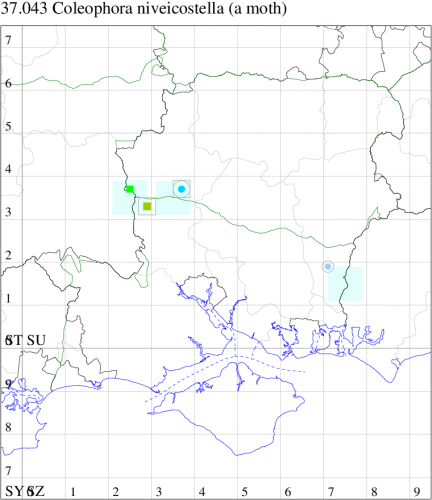 Rare (proposed as a future Red Data Book species) on dry grassland and downland in England, south of a line from the Severn to Humber estuaries. In Hampshire known from a handful of sites, including Porton Down, Oxenbourne, Broughton Down and Leckford. Not recorded from the Isle of Wight to date. Wingspan 11-13 mm. A fairly distinctive coleophorid, the main features being a clear white costal streak and white unringed antenna. Larva mines leaves of Wild Thyme, living within a movable case; case length 7-8 mm.