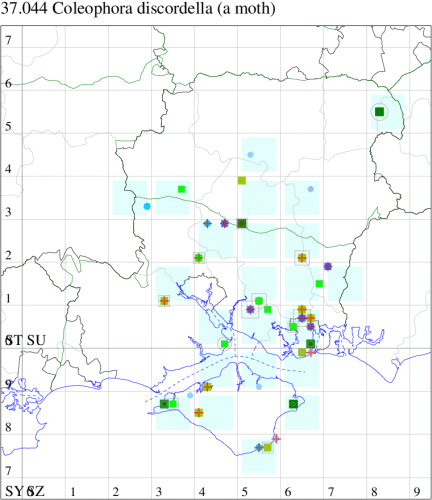 Common in rough grassland, downland and woodland clearings and in marshes and other damp places throughout much of the British Isles, except the Shetland Islands. In Hampshire and on the Isle of Wight rather infrequently recorded, with the usual concentration of records in the south-east of the county, probably under-recorded elsewhere. Wingspan 11-12.5 mm. Like many of the Coleophora, imagines are virtually impossible to identify without recourse to dissection, and the larvae, which live in cases of characteristic form and which can sometimes be found on the foodplant, may be easier to identify by comparison against a reference collection. Larva mines leaves of Common Bird's-foot Trefoil and Greater Bird's-foot Trefoil, living within a movable case.