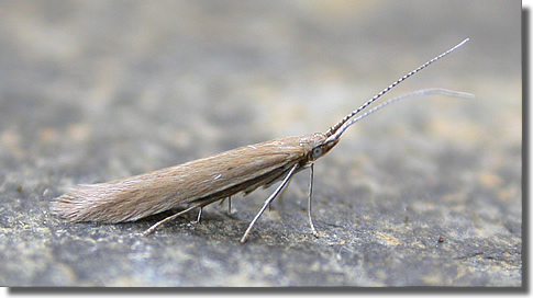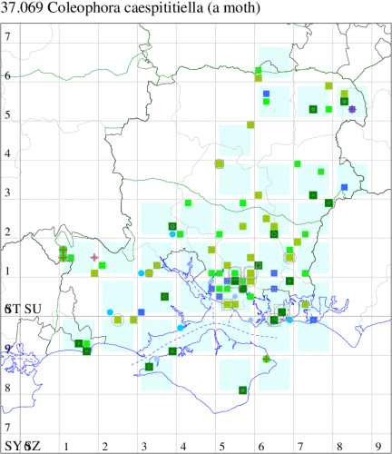 Common in woodland clearings, damp meadows and marshes, both salt and fresh-water, throughout much of England, Wales and southern Ireland. In Hampshire widespread; the paucity of records from the Isle of Wight no doubt reflects historical under-recording, as evidenced by an increase in known range in recent years. Wingspan 8-10 mm. Like many of the Coleophora, imagines are virtually impossible to identify without recourse to dissection. Larva feeds within seed capsules of Compact Rush, Soft-rush, Jointed Rush, Hard Rush and Saltmarsh Rush, subsequently living within a movable case.