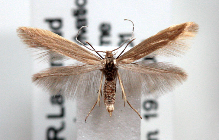 Nationally scarce (Nb) in woodland and open moorland in parts of south-western England, the west Midlands, Wales, Scotland and Ireland. Not recorded in Hampshire or on the Isle of Wight to date. Wingspan 9-14 mm. Like many of the Coleophora, imagines are virtually impossible to identify without recourse to dissection, and the larvae, which live in cases of characteristic form and which can sometimes be found on the foodplant, may be easier to identify by comparison against a reference collection. Larva feeds on flowers and seeds of Great Wood-rush, living within a movable case, over-wintering twice.