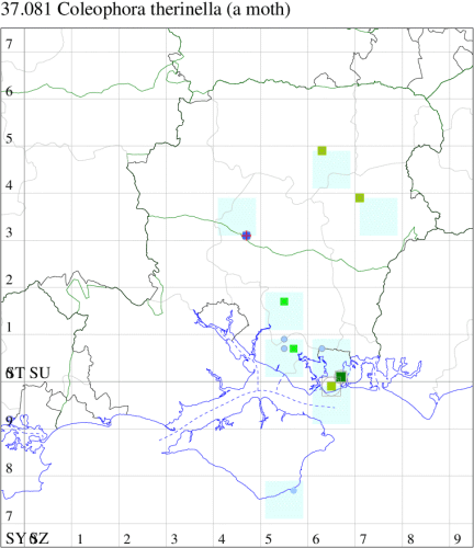 Nationally scarce (Nb) on waste ground and farmland in England, south of a line from The Wash to the Severn estuary, and in Ireland from the Burren district of Co. Clare (MBGBI Vol 3). In Hampshire occasional at light in the south-east of the county, at Botley Wood and in Southsea, outside this area, recorded only at Teg Down, Winchester, where the first cases ever to be found in Britain were discovered in August 1990. Not recorded from the Isle of Wight since 1900. Wingspan 13-16 mm. Very similar to