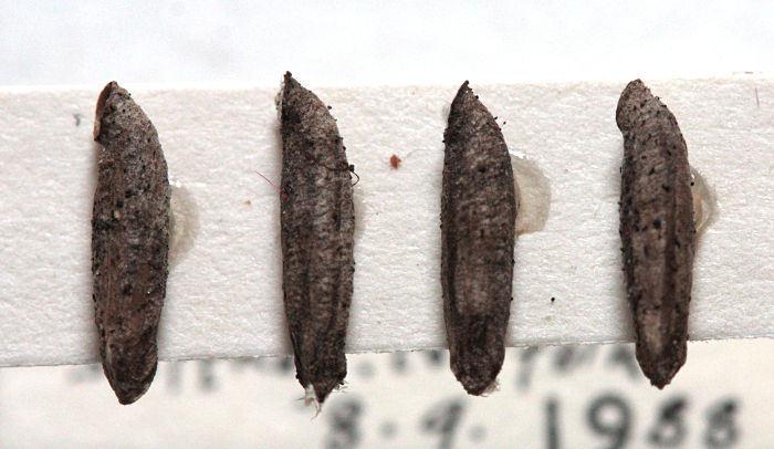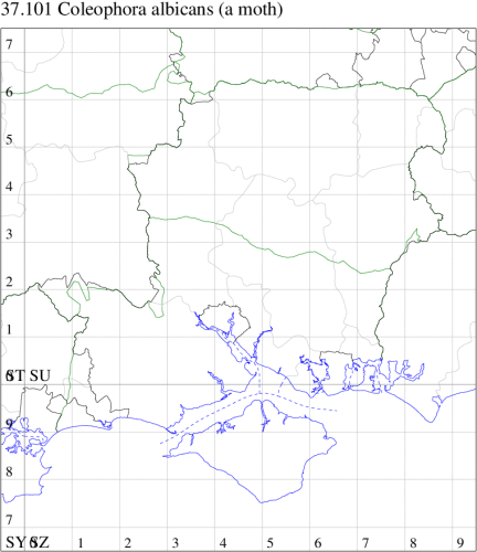Nationally scarce (Na) in saltmarshes on the eastern coast of England, from Kent to Northumberland, and also in Cheshire and Dorset (MBGBI Vol 3). Not recorded in Hampshire or on the Isle of Wight to date. Wingspan 10-13 mm. Like many of the Coleophora, imagines are virtually impossible to identify without recourse to dissection, and the larvae, which live in cases of characteristic form and which can sometimes be found on the foodplant, may be easier to identify by comparison against a reference collection. Larva feeds on seeds and leaves of Sea Wormwood, living within a movable case.