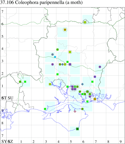 Local on roadside verges, rough grassland and waste ground throughout the British Isles, as far north as Aberdeenshire. In Hampshire common in the south-east, especially in and around Botley Wood, but likely under-recorded elsewhere in both counties, particularly on the chalk where it is known from scattered locations. Wingspan 10-13 mm. Like many of the Coleophora, imagines are virtually impossible to identify without recourse to dissection, and the larvae, which live in cases of characteristic form and which can sometimes be found on the foodplant, may be easier to identify by comparison against a reference collection. Larva mines leaves of Creeping Thistle and Common Knapweed, living within a movable case.