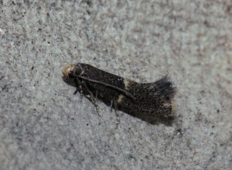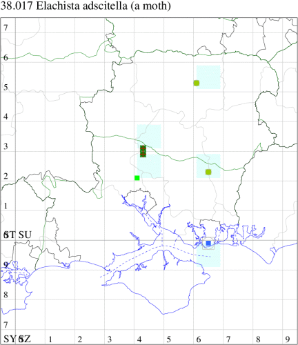 Nationally scarce (Nb) in woodland clearings in parts of England, Wales and southern Ireland. In Hampshire there have been a handful of records but not recorded from the Isle of Wight to date. Wingspan 9-11 mm. One of several, similar Elachista species, which are reliably separated only by dissection of the genitalia. Larva mines leaves of Tufted Hair-grass and Blue Moor-grass.