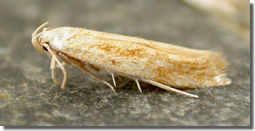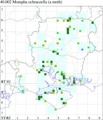 Common in damp areas throughout much of Britain, south of the Moray Firth. In Hampshire and on the Isle of Wight usually recorded in small numbers in most years, with apparent population centres in the south-east and around Basingstoke. Wingspan 14-16 mm. The only wholly yellow-ochreous Mompha. Larva mines stems and leaves of Great Willowherb.