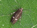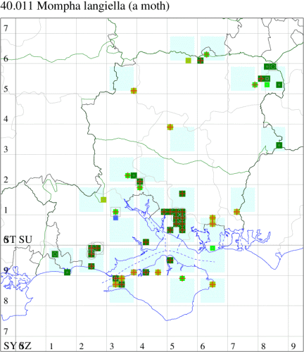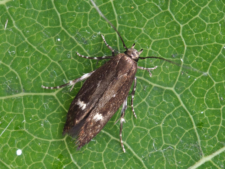 Local in woodland in parts of England and Wales, more numerous in the west, rare elsewhere. In the south of Hampshire the mines of this species are often locally abundant, but until a specimen was bred by Rob Edmunds in Fleet in 2003 it had not been recorded in vice-county 12, and on the Isle of Wight first recorded in 2009 at Combley Great Wood. The photo shows one bred in 2004, again by Rob. Wingspan 9-10.5 mm. Larva mines leaves of Enchanter's-nightshade and Great Willowherb.