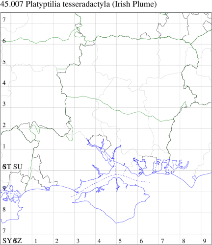 Known only from limestone downland in parts of Eire, particularly on the Burren in County Clare but also from south-east Galway and west Mayo. While there is a specimen in BMNH labelled as being from Folkestone, Kent, 1912, this must be an error, and not expected to be recorded in Hampshire or on the Isle of Wight. Wingspan 17-20 mm. Larva feeds on stems of Mountain Everlasting Antennaria dioica. See Plant (2011) for details.