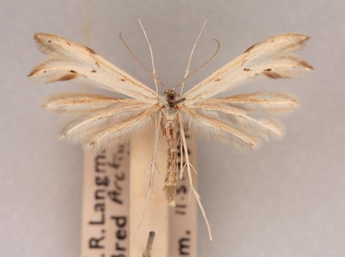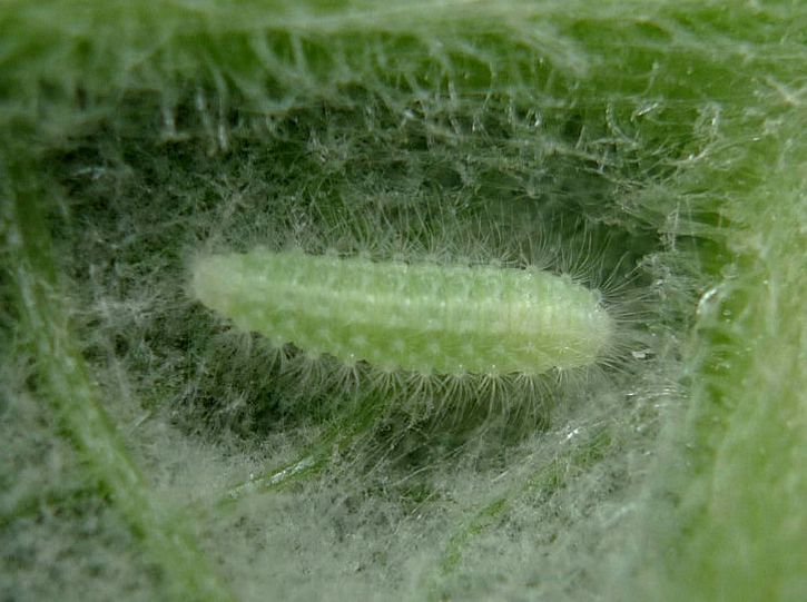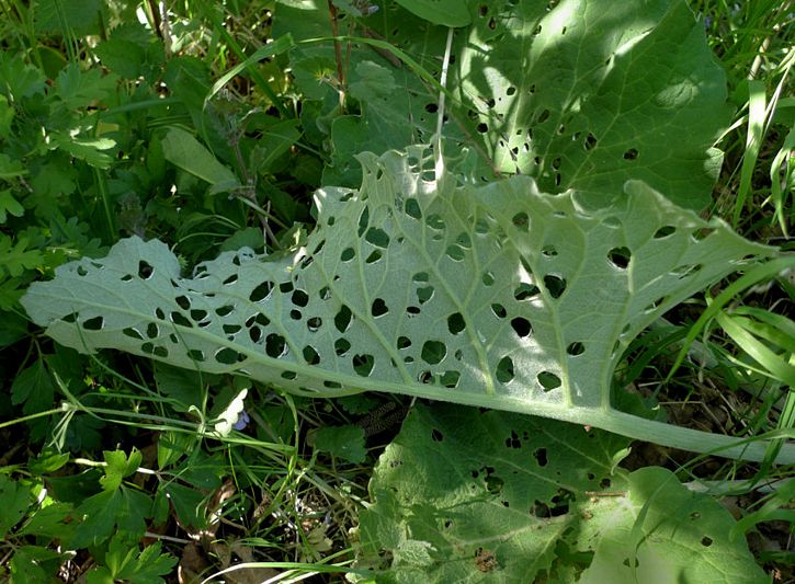Nationally scarce (Nb) in open woodland and dry pastures throughout much of southern England and southern Wales. In Hampshire and on the Isle of Wight recorded from all three vice-counties but not recently from the Isle of Wight. Wingspan 20-25 mm. Forewing pale with diagnostic backward-pointing rear lobe, but imago seldom encountered, and the species is much more likely to be recorded in the larval stage, when feeding signs are relatively easy to find where they are present. Larva feeds on Lesser and Greater Burdock, making characteristic large holes in the leaves and often found nearby, resting along the edge of a vein on the underside of the leaf.