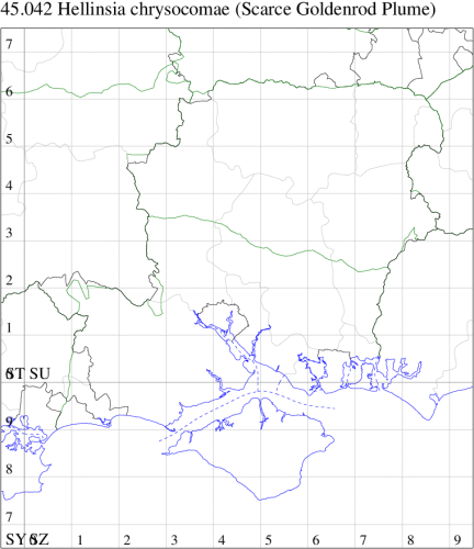 Endangered (proposed as a future Red Data Book species) in woodland in south-eastern England. Not recorded in Hampshire or on the Isle of Wight to date. Larva feeds on Goldenrod, Common Ragwort and Goldilocks Aster.
