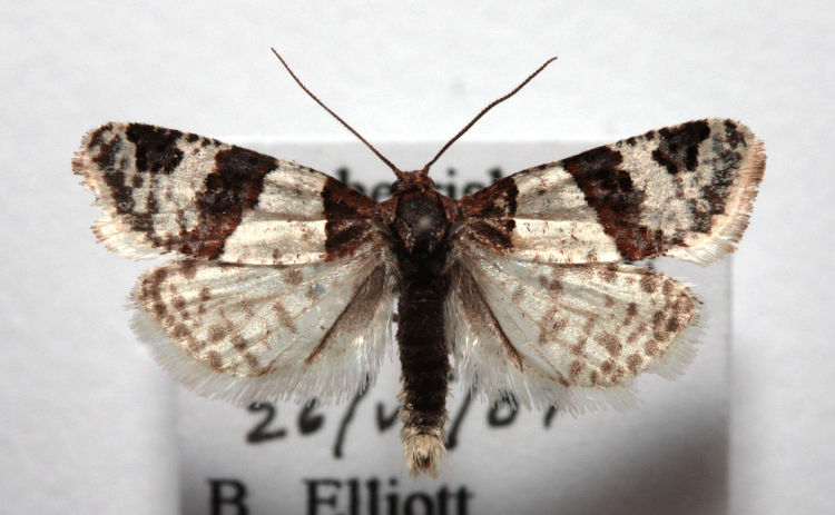 Endangered (proposed as a future Red Data Book species) on chalk downland and calcareous grassland. The species was declared extinct in Kent around 1950, but subsequently re-discovered on Tiree, Inner Hebrides in 1984. Unlikely to be recorded in Hampshire or on the Isle of Wight. Wingspan 14-18 mm. The white ground coloration and contrasting markings are distinctive of this species [Bradley]. Larva feeds on Kidney Vetch, Bird's-foot Trefoil, Dyer's Greenweed, Petty Whin, Broom and similar, living within a silken tube or tent.