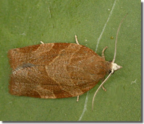 Dark Fruit-tree Tortrix P. heparana, from which the male may be distinguished by the white head and the female by the presence of reddish ochreous suffusion in the apical area of the hindwing [Bradley]. Larva feeds on various deciduous trees and shrubs, living within a spun or rolled leaf.