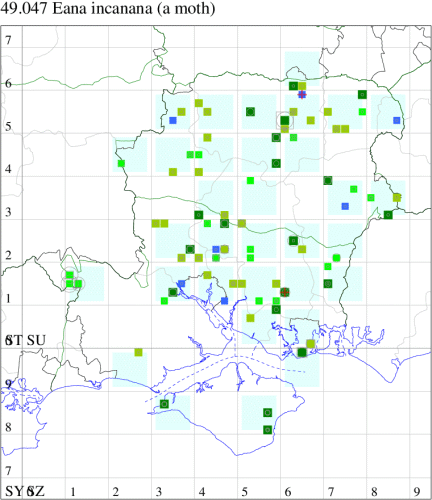 Local in woodland throughout much of Britain. In Hampshire fairly widespread, but not particularly common, in most areas, except for the New Forest. It is relatively scarce on the Isle of Wight. Wingspan 17-22 mm. The rounded forewing and conspicuous curved subbasal fascia are characteristic [Bradley]. Larva feeds in a web in the flowers of Bluebell and possibly Wild Garlic (references to other pabula, such as Ox-eye Daisy, are potentially doubtful).