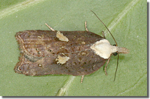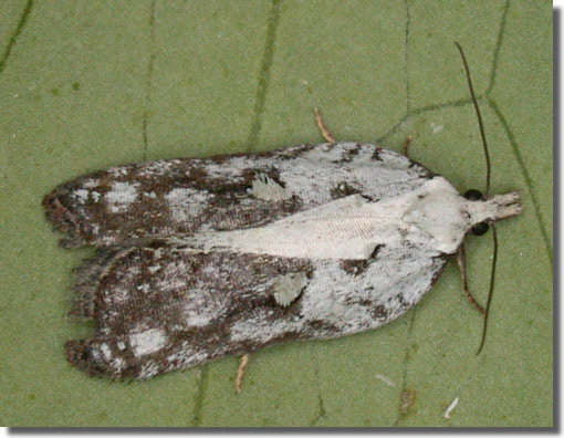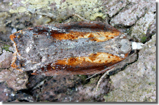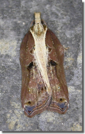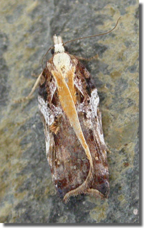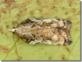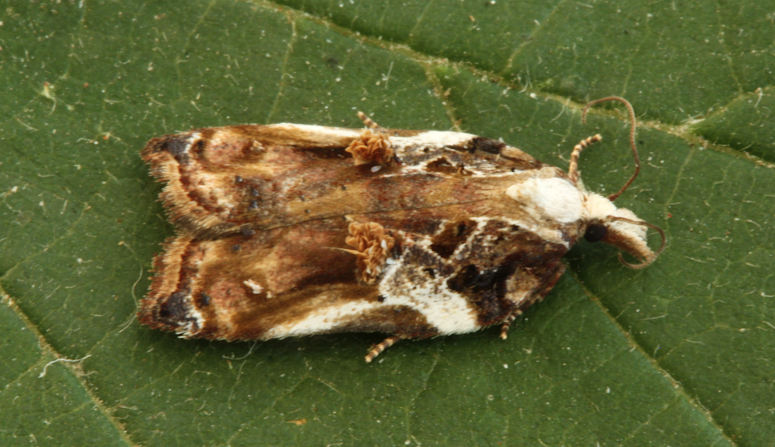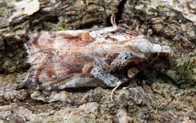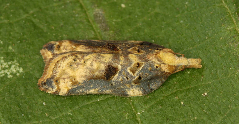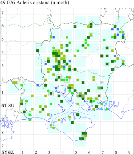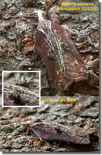 Common in woodland throughout much of southern England. Reasonably well distributed across Hampshire and the Isle of Wight. Wingspan 18-22 mm. The very large coarse-scaled tuft situated towards the end of the discal cell on the forewing is peculiar to A. cristana, and is present in most forms, readily distinguishing this species from others in the genus Acleris [Bradley]. Larva feeds on various herbaceous trees and shrubs, including Blackthorn, Hawthorn, Beech, Oak, Birch, Hazel, Lime and Elm, living within a spun or rolled leaf.