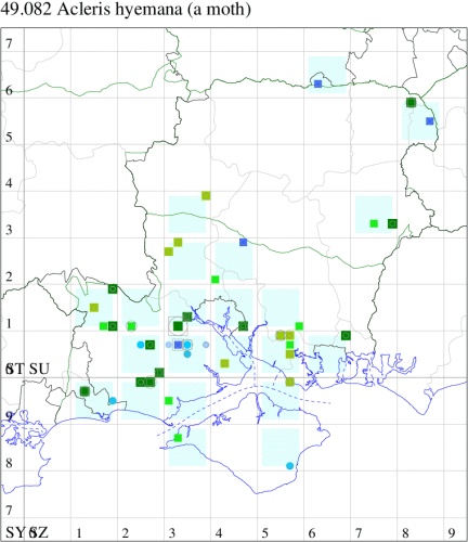 Local on heathland and moorland throughout much of the British Isles. In Hampshire most frequent in the New Forest; there is one record from the Isle of Wight and a few from outside the New Forest, which suggest the species may, on occasion, adapt to cultivated heathers. Wingspan 14-20 mm. The narrow forewings with prominent apex, especially in the female, and the purplish brown and silver-white coloration are characteristic [Bradley]. Larva feeds on Heather and Bilberry, living between shoots spun together with silk.