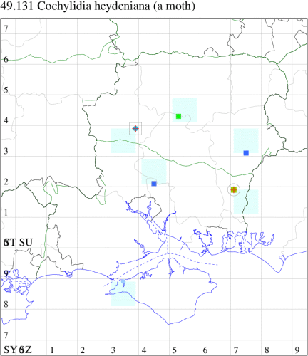 Nationally scarce (Na) on dry pastures, waste ground and sand-dunes in parts of southern England. In Hampshire recorded in recent years from Chilbolton, Chandlers Ford, Noar Hill and Black Wood, Micheldever. Not recorded from the Isle of Wight since 1900. Wingspan 9-13 mm. Usually smaller than