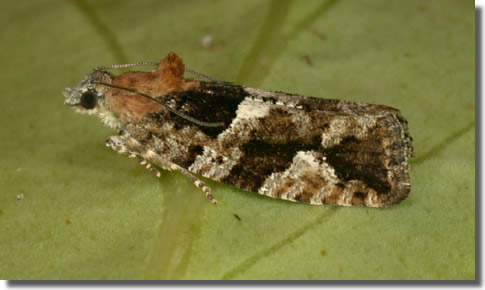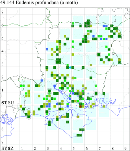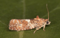 Common in oak woodland, in England, Wales and southern Ireland. Widespread and fairly common to common in oak woodland in Hampshire and on the Isle of Wight. Wingspan 14-20 mm. The rather broad, rounded forewing and general marbled appearance are characteristic of the two