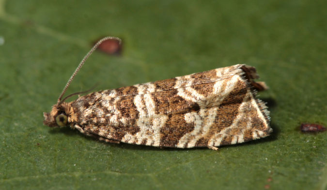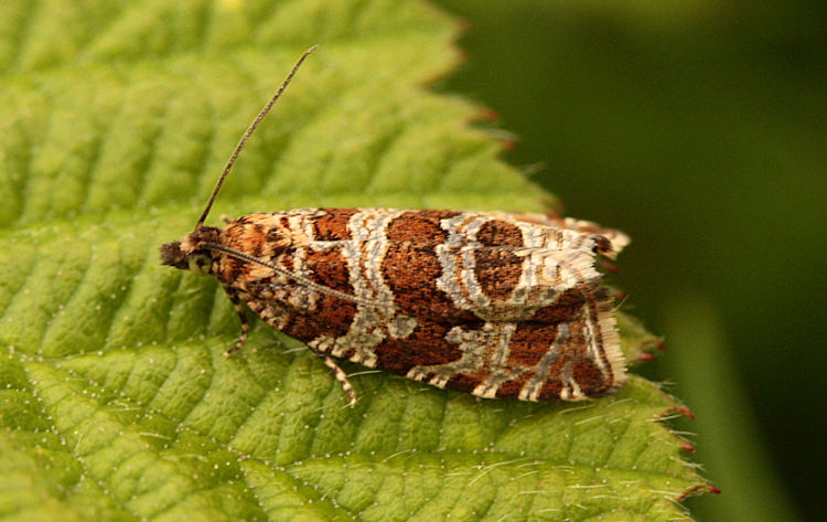 Local in a wide range of habitats, including open woodland, chalk downland and sandhills, throughout the British Isles. In Hampshire uncommon, found only at a few sites, on downland at Leckford, and at Porton Down, Old Burghclere Lime Quarry, and Micheldever Spoil Heaps. Not recorded from the Isle of Wight to date. Wingspan 15-19 mm. A distinctive species, having well-defined forewing markings which normally contrast with the silvery white ground colour. Larva polyphagous on the flowers and shoots of various herbaceous plants, living in a silk spinning.