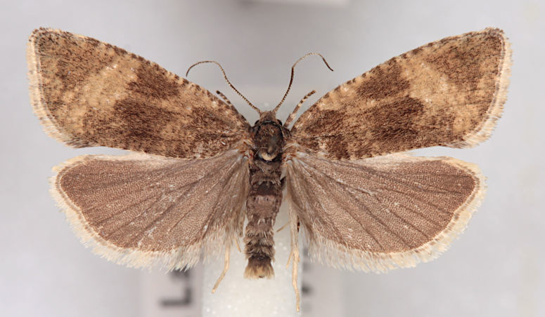 Celypha lacunana, but in the latter the subterminal fascia of the forewing is narrow and comparatively well defined and extends into the cilia [Bradley]. Larva feeds on Bilberry, living within a spun or rolled leaf.