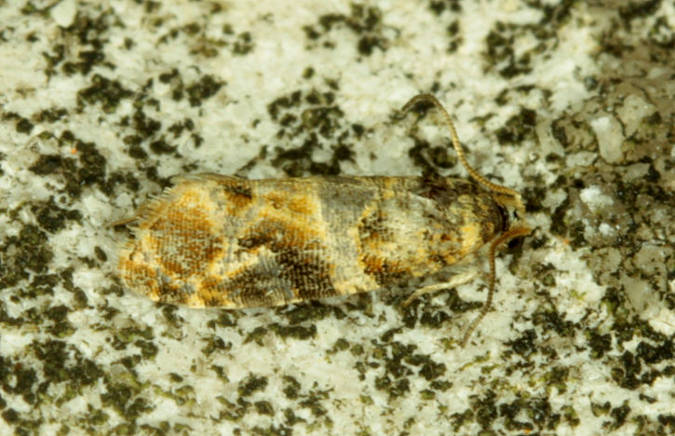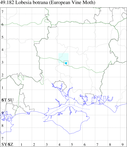 Suspected rare immigrant, or perhaps accidentally imported, from southern Europe. Recorded on fewer than ten occasions, first recorded in July 1976 in a garden in Enfield, Middlesex. In Hampshire there is a single record, from Winchester, in August 1989. Not recorded from the Isle of Wight to date. Wingspan 10-17 mm. The plumbeous suffusion of the ground colour, forming a subquadrate patch medio-dorsally and bordering the outer edge of the median fascia costally and enclosing the tornal marking, is characteristic [Bradley]. Larva feeds within fruit of various shrubs and climbing plants, including Traveller'-joy, Ivy, Honeysuckle and Grape-vine, living between fruit spun together with silk, causing sufficient damage to be a serious pest on grape vines in some areas.
