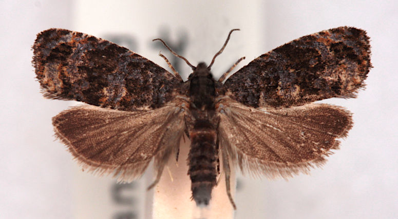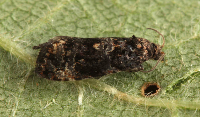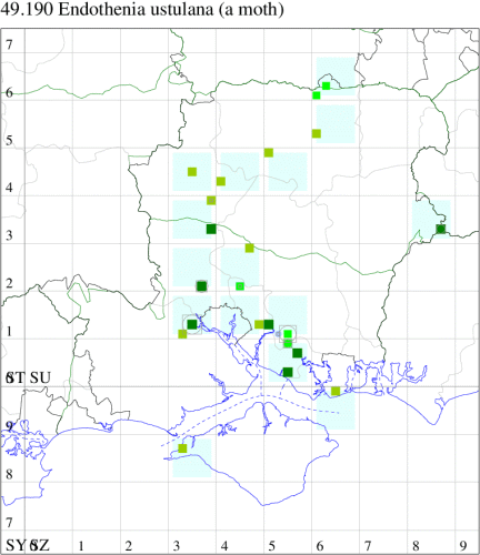 A local species in woodland and waste ground in parts of England and Wales, mainly in the south and south-east. Historically recorded in numbers only in Botley Wood, but in the current century reported occasionally from scattered localities in both vice-counties of Hampshire; there is only one recent record from the Isle of Wight, from Freshwater in 2017. Wingspan 9-13 mm. The general coloration of the forewing is darker than in