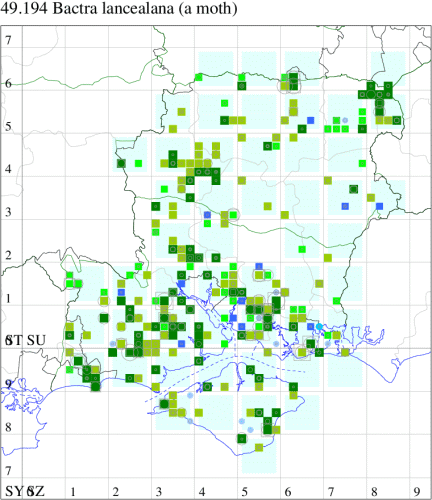 B. lancealana superficially and dissection of the genitalia may be necessary [Bradley]. Larva feeds within stems of Compact Rush, Common Club-rush and Deergrass.