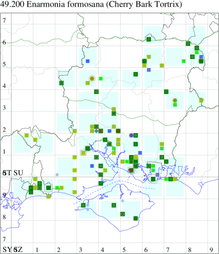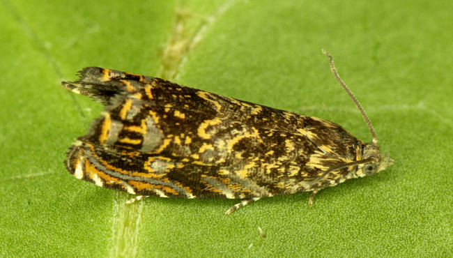 Local in gardens, parks and orchards throughout much of Britain, but not in northern Scotland. In Hampshire generally widespread, but perhaps over-looked in some areas. There have been no recent records from the Isle of Wight. Wingspan 15-19 mm. The distinctive coloration and pattern of the forewing, especially the well-developed ocellus and the sharply defined costal strigulae in the apical half which are bordered dorsad by ferruginous-orange, are characteristic [Bradley]. Larva feeds within bark of fruit trees.
