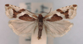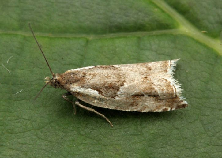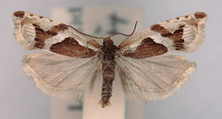 Local on moorland, damp heathland and mosses throughout much of northern England and Scotland. Unlikely to be recorded in Hampshire or on the Isle of Wight. Wingspan 12-16 mm. The whitish grey ground colour of the forewing and the almost triangular basal patch, which is constricted or interrupted below its apex, are characteristic [Bradley]. Larva feeds on Bilberry and Bog Bilberry, living within a spun or rolled leaf, over-wintering in a cocoon.