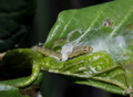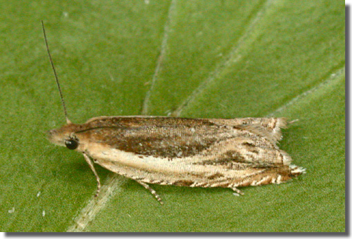 Nationally scarce (Nb) in woodland and fens throughout much of southern England and southern Wales; rare in northern England. In Hampshire principally restricted to heathland in the New Forest and in the north-east of the county, and sites such as Emer Bog, Botley Wood, Wickham Common Havant Thicket and Pamber Forest. Recorded once on the Isle of Wight, at Cranmore SSSI in June 2003. Wingspan 13-17 mm. Characterised by the acutely angled median fascia of the forewing, which is very slender costally and forms a dark triangular patch medially [Bradley]. Larva feeds on Buckthorn and Alder Buckthorn, living between leaves spun together with silk, over-wintering in a cocoon.