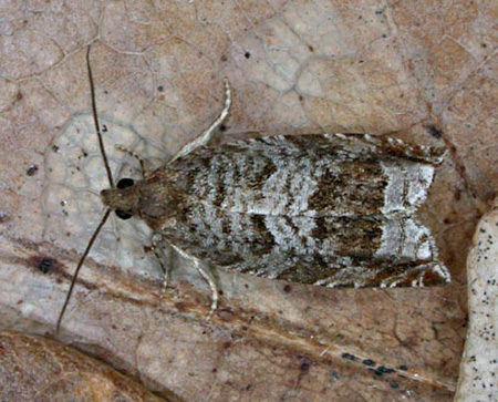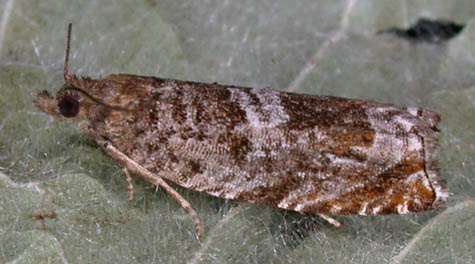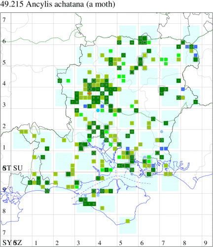 Common in hedgerows, thickets and copses throughout much of southern England, with records north to Yorkshire. In Hampshire widespread and fairly common, but on the Isle of Wight only two recent records at Freshwater in 1993 and 1999. Wingspan 14-18 mm. Differs from other British Ancylis species by its obtusely falcate, broad forewing and comparatively well-defined fasciate markings which in the tornal area are developed into a prominent quadrate or triangular blotch [Bradley]. Larva feeds on Hawthorn and Blackthorn, living within a spun or rolled leaf.