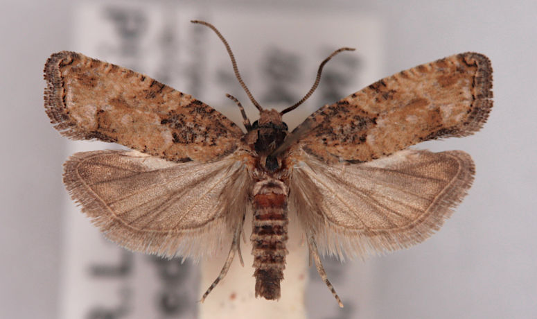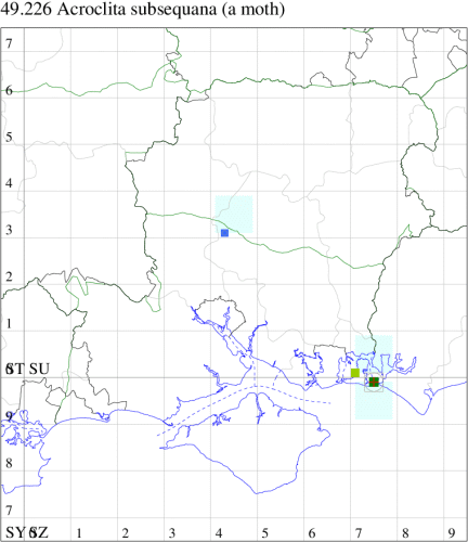 Endangered (proposed as a future Red Data Book species) on shingle beaches and sandy beaches in parts of southern England, predominantly coastal. In Hampshire following old records from southern Hampshire, nothing more was heard of this moth until larvae were found at Sandy Point on Hayling Island in June 1996. Not recorded from the Isle of Wight to date. Wingspan 14-16 mm. The pale ochreous ground colour and the tawny markings of the forewing, which are only slightly darker and do not contrast strongly, give this species a characteristic appearance; the two small tufts of raised black mixed with whitish scales on the outer edge of the basal patch are a useful diagnostic character [Bradley]. Larva feeds on Sea Spurge and Portland Spurge, living between leaves and shoots spun together with silk, over-wintering in a cocoon.