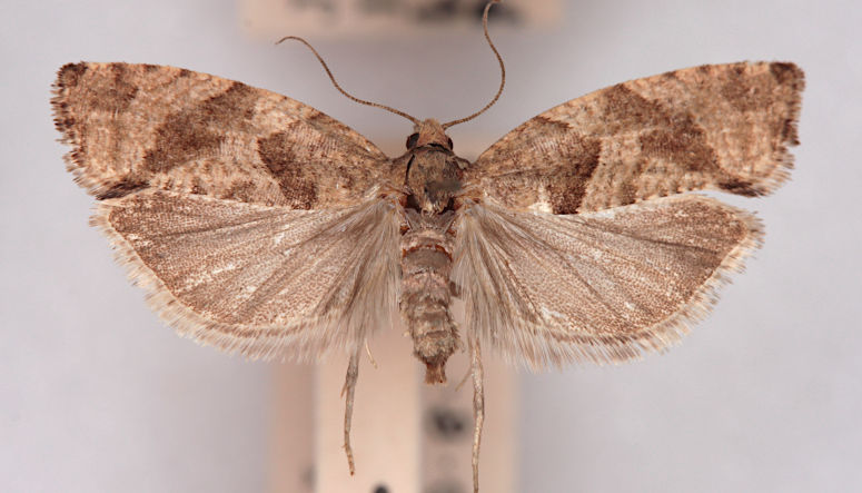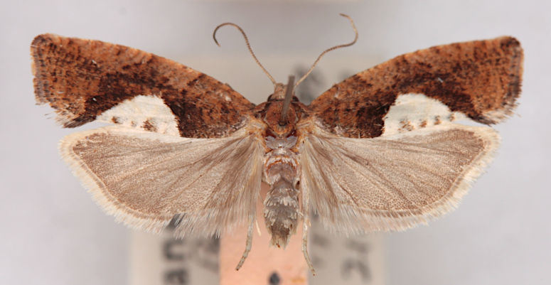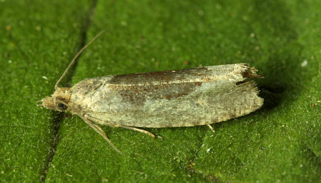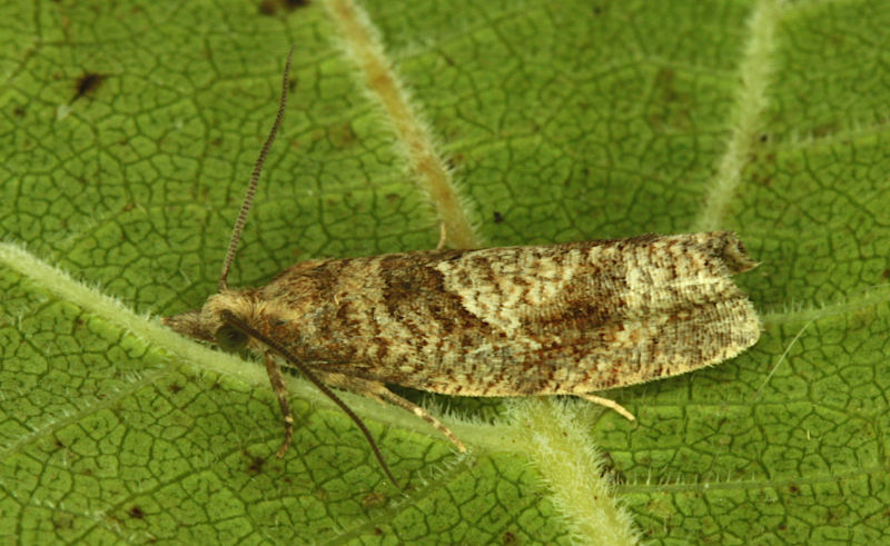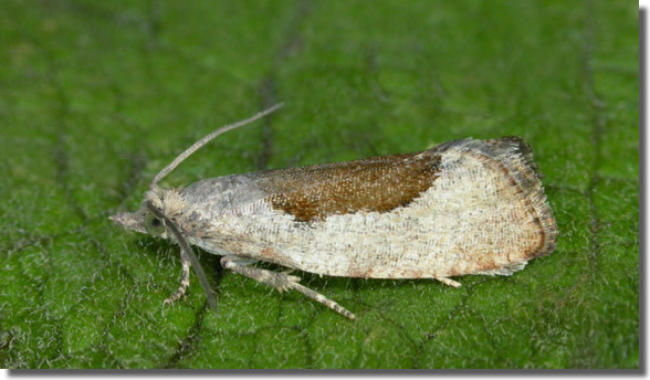 Common in woodland and scrubland throughout much of the British Isles. In Hampshire widespread and common, but with only scattered records from the Isle of Wight. Wingspan 15-21 mm. The nominate form of E. solandriana with the elongate-semiovate dorsal blotch on the forewing is distinctive, but forms with fasciate markings or with a white triangular blotch of ground colour dorsally can be confused with similar forms of E. brunnichana; in E. solandriana the dorsal blotch is triangular instead of subquadrate [Bradley]. Larva feeds on Birch, Hazel and Goat Willow, living within a spun or rolled leaf.