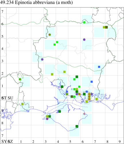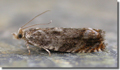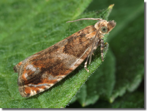 Common in hedgerows and woodland throughout much of the British Isles, favouring low-lying areas. In Hampshire still fairly common, especially in the south-east, with scattered records in the north, but largely absent from the New Forest and on the Isle of Wight, where there are only two recent records. Wingspan 12-16 mm. Well-marked specimens are characterised by the well-defined basal patch, which is angular medially and broadly edged throughout with the light ground colour, and the median fascia being more or less edged throughout distally with plumbeous strigulation; in dark or almost unicolorous specimens this plumbeous strigulation is still evident [Bradley]. Larva feeds on buds of Elm, revealing a highly distinctive arc of holes, subsequently living within a spun leaf.