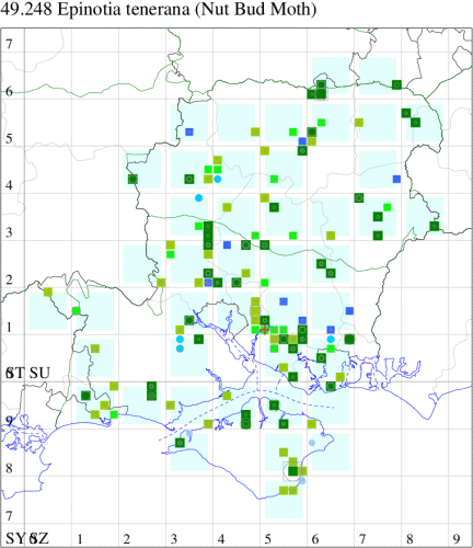 A. mitterbacheriana, but the latter is distinguished by the falcate apex of the forewing [Bradley]. Larva feeds within catkins of Hazel and Alder, subsequently burrowing into and feeding on leaf buds.