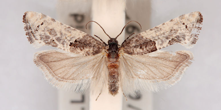 Rare (proposed as a future Red Data Book species) on chalky ground, sea cliffs and other rough ground in parts of south-eastern England. Not recorded in Hampshire or on the Isle of Wight to date. Wingspan 13-17 mm. Distinguished from other Eucosma species by the relatively large and well-defined basal patch edged with raised black scales and the lack of an ocellus on the forewing [Bradley]. Larva feeds on flowers and seeds of Dog-rose, living between flowers spun together with silk, over-wintering as a pupa.