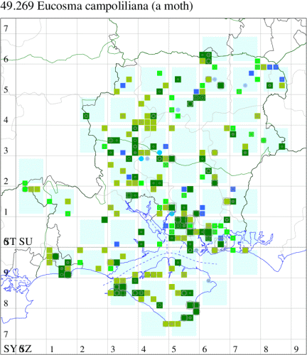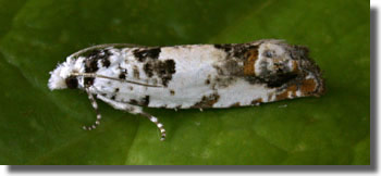 Common in dry pastures, sand-dunes and waste ground throughout the British Isles, most numerous in coastal districts. Fairly well distributed in Hampshire, particularly on chalk downland and near the coast, but very rarely recorded on the Isle of Wight. Wingspan 13-18 mm. A distinctive species, characterised by the white ground colour of the forewing and the contrasting, fragmented, ferruginous-ochreous and black markings [Bradley]. Larva feeds within flowerheads of Common Ragwort, over-wintering in a cocoon.