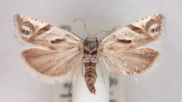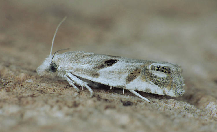 E. lacteana by the contrasting fasciate markings and white ground colour of the forewing and the well-developed, distinctively marked ocellus [Bradley]. Larva feeds within stems and roots of Wormwood.