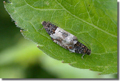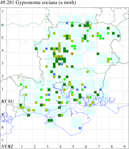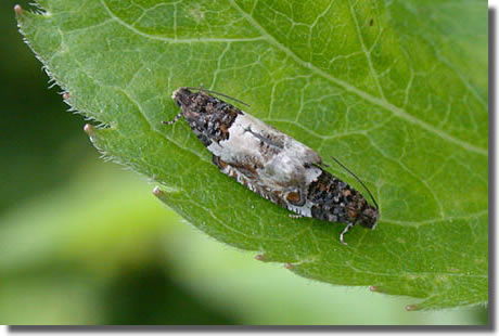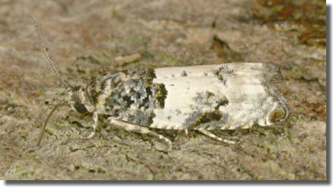 Common in woodland, gardens, orchards, parks and on freshwater margins throughout much of Britain. In Hampshire widespread but rather local in all but the east central area, where apparently absent. On the Isle of Wight, there are recent records only from Shanklin and Totland. Wingspan 12-15 mm. Distinguished from other Gypsonoma species by the clear white frons and vertex of the head; the strongly contrasting, plumbeous strigulate with black forewing markings and the white ground colour are also characteristic [Bradley]. Larva feeds within catkins of Black Poplar, Aspen and Sallow, subsequently burrowing into and feeding on leaf buds.