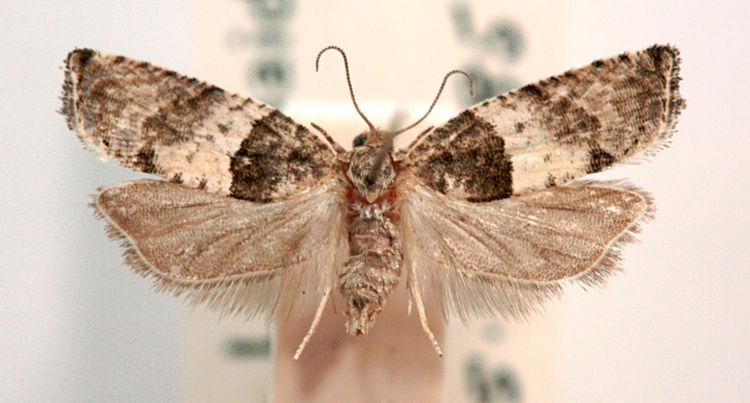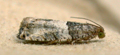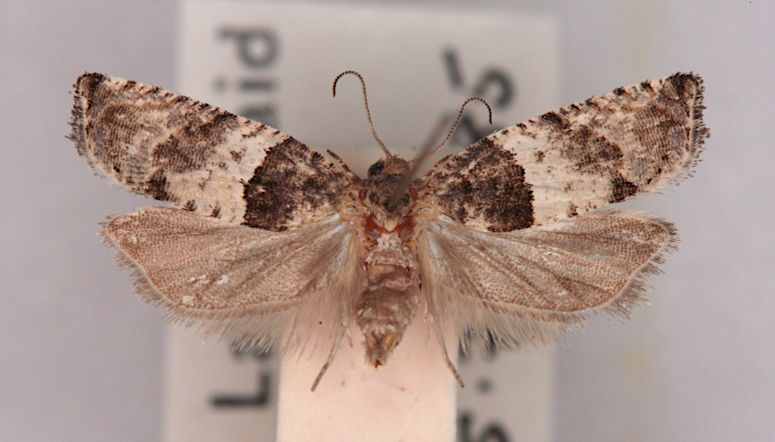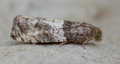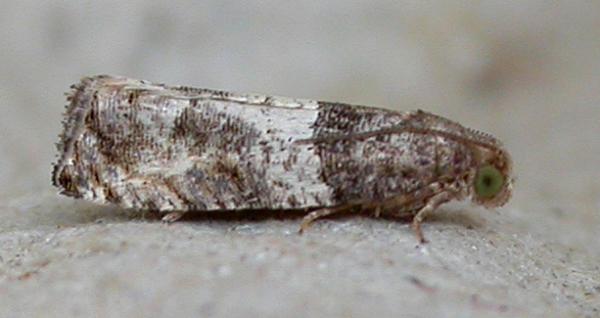 G. dealbana by the stronger and more extensive ochreous suffusion of the ground colour, the less angulated, straighter-edged basal patch and the black-centred ochreous apical spot of the forewing [Bradley]. Larva mines leaves and petioles of Poplar, living between leaves and petioles spun together with silk, subsequently burrowing into and feeding on stems.
