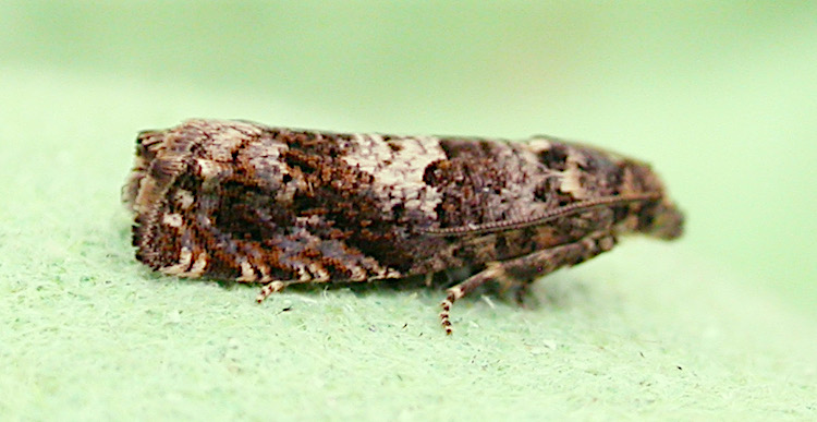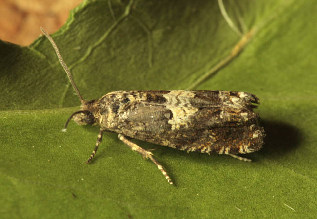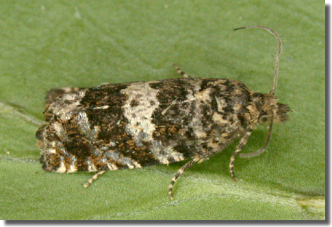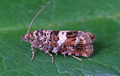 E. cnicicolana but distinguished by the better-defined and ferruginous-brown fasciate markings of the forewing, the more sharply defined costal strigulae and the subquadrate medio-dorsal blotch which is weakly strigulate and sometimes connected to the costa by whitish striae [Bradley]. Larva feeds within lower stems and roots of Common Ragwort, over-wintering in a cocoon.
