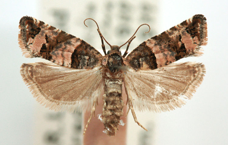 E. roborana and other related species by the normally pronounced pink suffusion of the forewing ground colour [Bradley]. Larva feeds on Wild Rose, living within a spun or rolled leaf.