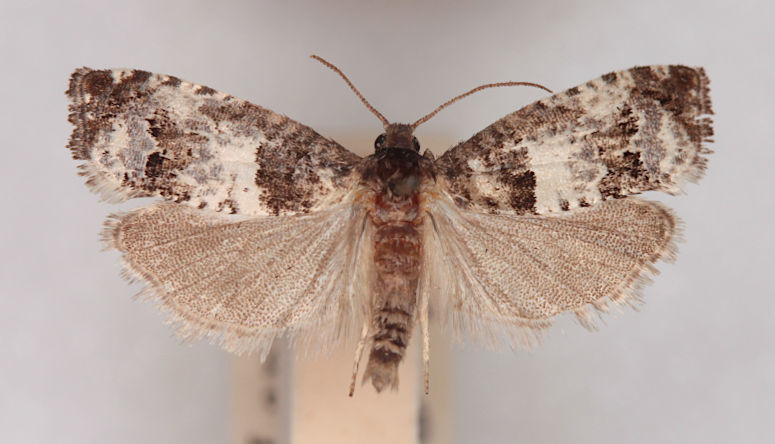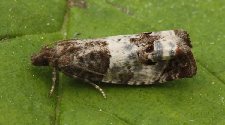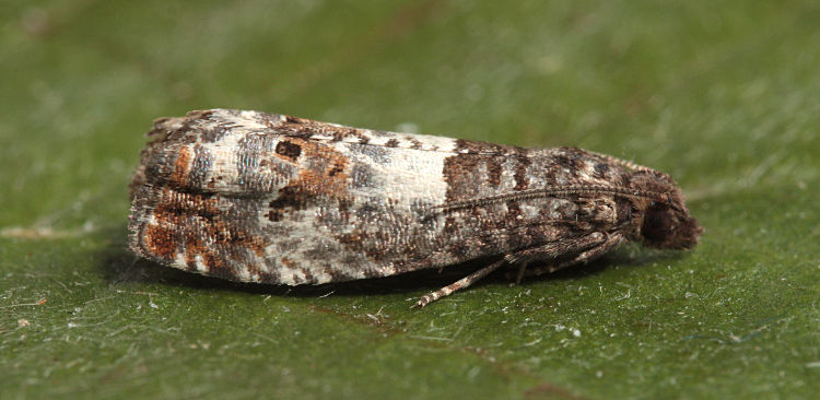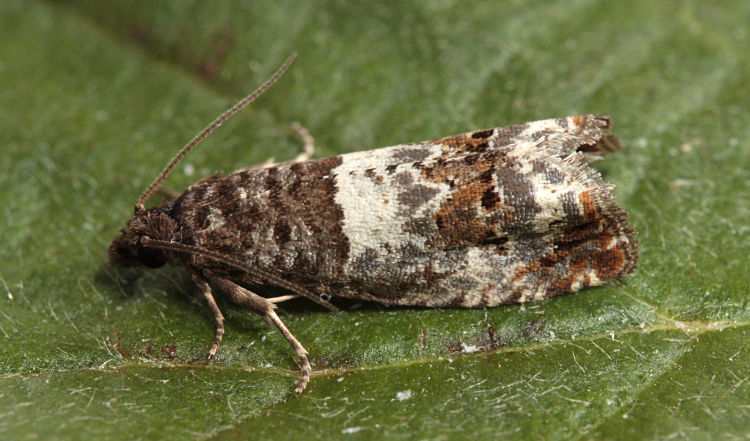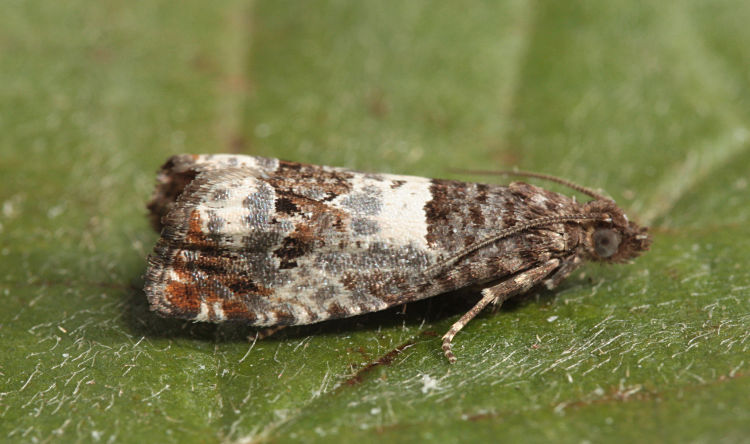 E. rosaecolana by its generally smaller size and comparatively narrow forewing which is somewhat darker in general coloration and has thicker, less oblique costal strigulae [Bradley]. Larva feeds on Hawthorn, living between leaves and shoots spun together with silk, over-wintering as an egg.