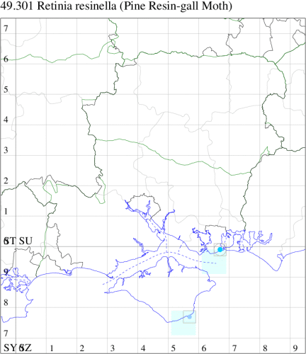 Nationally scarce (Na) in pine woodland throughout much of Britain, mostly in the north and east. In Hampshire recorded just once to date, at Southsea in May 1989. Recorded on the Isle of Wight for the first, and so far only, time at Ventnor in 1856. Wingspan 16-22 mm. Reminiscent of