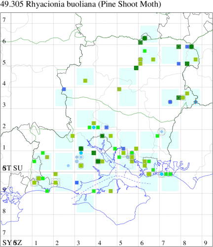 Local in pine woodland, plantations and nurseries throughout much of England and Wales, rare elsewhere. In Hampshire common in Scots Pine woodland, especially in young plantations. Recorded on the Isle of Wight for the first time since 1948 at Cranmore in 2004. Wingspan 16-24 mm. Distinguished from