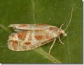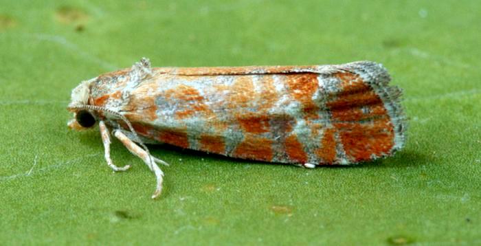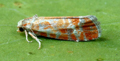 R. pinicolana by the straighter costa, the distinctly orange markings and the triangular pre-tornal marking of the forewing, and the generally darker hindwings [Bradley]. Larva feeds within needles and young shoots of Scots Pine, Lodgepole Pine and Corsican Pine, subsequently burrowing into and feeding on developing buds, causing sufficient damage to be a serious pest in some areas.