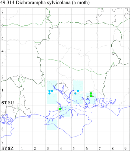 Rare (proposed as a future Red Data Book species) in marshy woodland, damp pastures, river-banks and ditches in parts of south-eastern England. In Hampshire there are recent records only from Hookheath Meadows NR and Needs Ore; has been recorded in the past from Chandlers Ford, Botley Wood, Emer Bog and Ashurst. Not recorded from the Isle of Wight since 1930. Wingspan 10-14 mm. The dark general appearance and the dense orange-ochreous irroration in the distal half of the forewing and the pale ochreous-yellow medio-dorsal blotch are characteristic [Bradley]. Larva feeds within roots of Sneezewort.