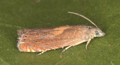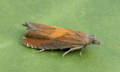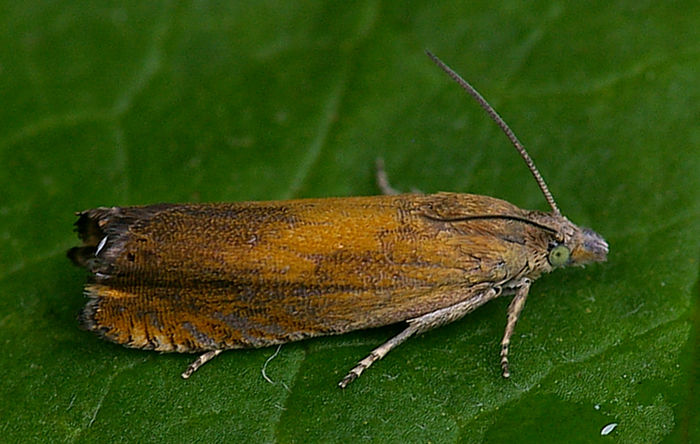 D. flavidorsana by the sombre general coloration of the forewing, which is suffused with comparatively dull ochreous-orange and has a dull and inconspicuous medio-dorsal blotch [Bradley]. Larva feeds within roots of Yarrow and Tansy.