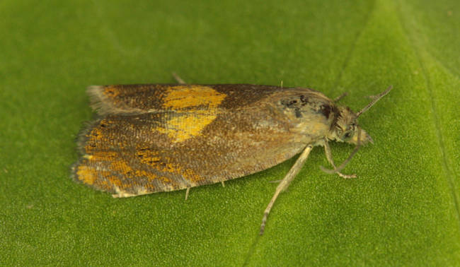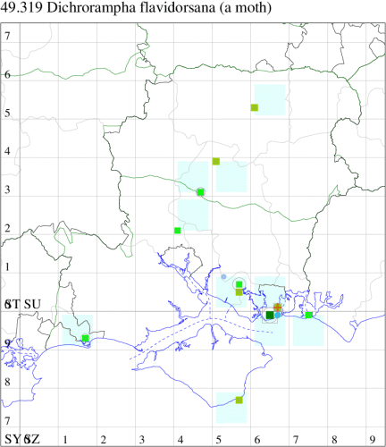 Nationally scarce (Nb) in dry pastures, gardens, orchards, parks and waste ground throughout much of southern Britain, predominantly coastal in the north of its range. In Hampshire very local, mainly in the south with a couple of sites further north on the foodplant in gardens. First recorded from the Isle of Wight in 2013. Wingspan 13-16 mm. Differs from D. alpinana by the comparatively narrow medio-dorsal blotch of the forewing and the uniformly dark fuscous hindwing; the male of D. flavidorsana is further distinguished by the shorter costal fold which does not extend to the median fascia on the forewing [Bradley]. Larva feeds within roots of Tansy.