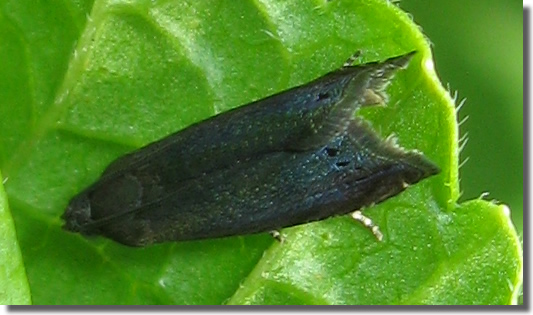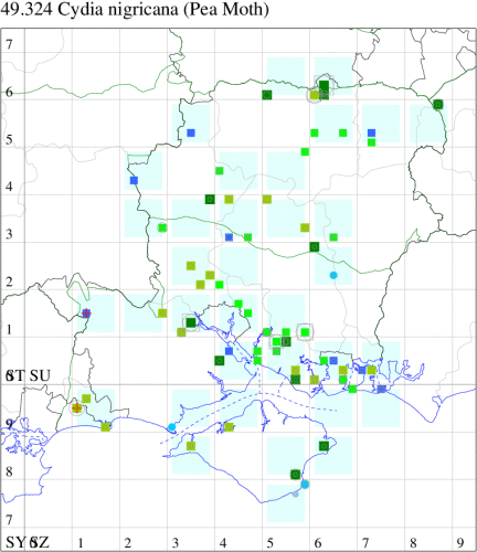 Common in allotments, market gardens, farmland and rough ground throughout much of Britain, more numerous in the south; rare in Ireland. In Hampshire and on the Isle of Wight until recently a familiar sight in garden peas but now quite rare in some areas. Wingspan 12-16 mm. Distinguished by the overall uniform brown or grey-brown appearance of the forewing, which is finely irrorate with pale ochreous distally and has a poorly developed ocellus and usually conspicuous costal strigulae and interspaces; in the hindwing the white or cream-white cilia are characteristic and contrast strongly with the dark fuscous coloration of the wing; the male is further distinguished by the presence of a dorsal fold along the inner margin [Bradley]. Larva feeds within pods of Pea, Sweet Pea and Common Vetch, causing sufficient damage to be a serious pest in some areas, over-wintering in a silken chamber.