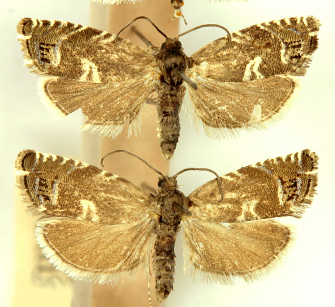 Vulnerable (proposed as a future Red Data Book species) in pine woodland in parts of the Scottish Highlands and unlikely to be recorded in Hampshire or on the Isle of Wight. Wingspan 12-15 mm. Differs from C. coniferana by the slightly broader, more strongly falcate medio-dorsal blotch and the comparatively distinct, widely spaced, white costal interspaces, but safe determination requires dissection. Larva feeds within bark of Scots Pine.